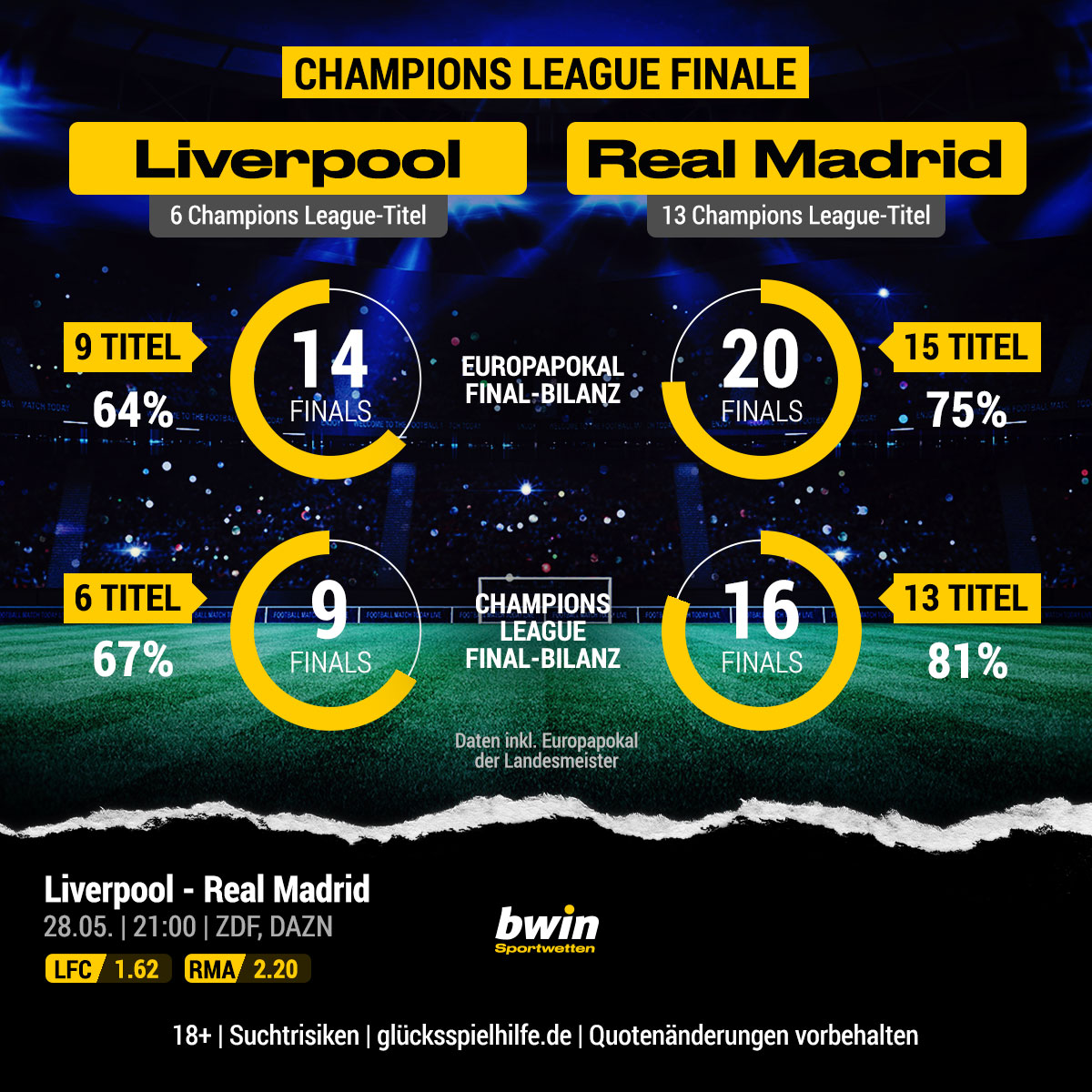 Gewinnen die Königlichen aus Madrid ihren 14. CL-Titel, zahlt bwin das 3,50-Fache des Einsatzes zurück. Ein Unentschieden nach 90 Minuten ist mit Quote 3,60 notiert.