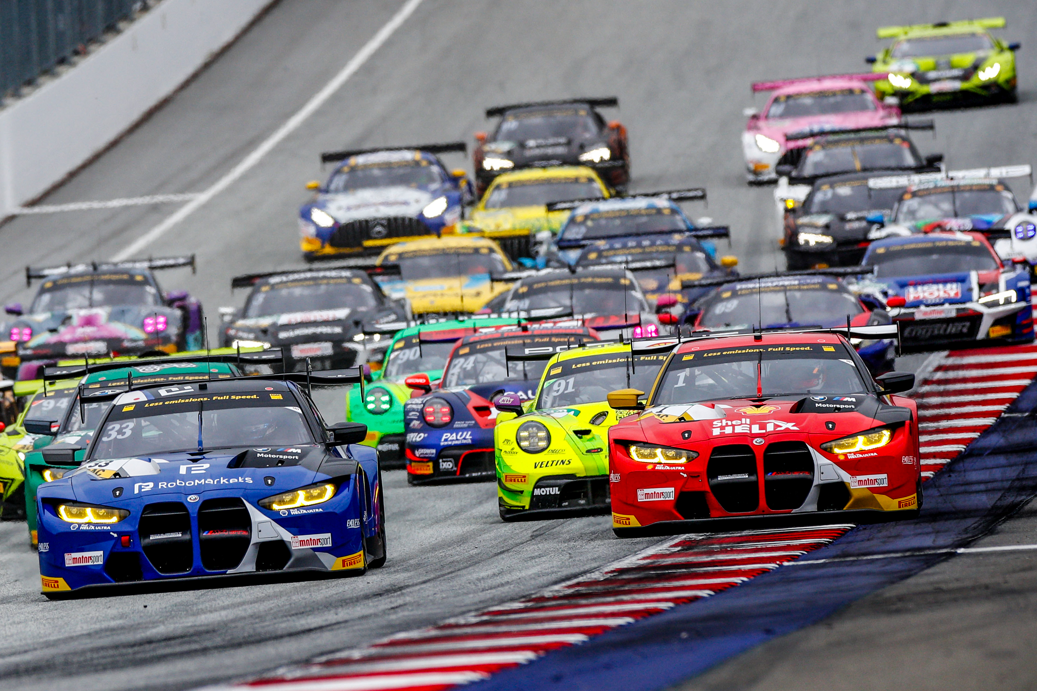 Die Top-Fahrer absolvierten ihren Pflicht-Boxenstopp erst spät, um flexibel zu sein, da erste Regentropfen fielen. Es blieb jedoch bei leichtem Nieseln, das die Streckenverhältnisse nicht entscheidend veränderte. Somit kehrten alle Fahrzeuge mit Slicks auf die Strecke zurück. Das Führungs-Trio Rast, Sheldon van der Linde und Preining überzeugte mit schnellen Reifenwechseln und behauptete die ersten drei Podiumsplätze souverän bis ins Ziel. Wittmann konnte sich noch auf Rang vier verbessern, Dennis Olsen (N) stellte seinen Porsche 911 GT3 R nach 41 Runden als Fünfter ab. Lokalmatador Schmid vom GRT Grasser-Racing-Team aus dem österreichischen St. Margarethen belegte Platz sechs vor einem weiteren Porsche 911 GT3 R mit Ayhancan Güven (TR) am Steuer. Es folgten die beiden Teamkollegen Jack Aitken (GB) und Thierry Vermeulen (NL) im Ferrari 296 GT3 von Emil Frey Racing auf den Rängen acht und neun. Arjun Maini (IND) war als zehnter schnellster Mercedes-AMG-Pilot.