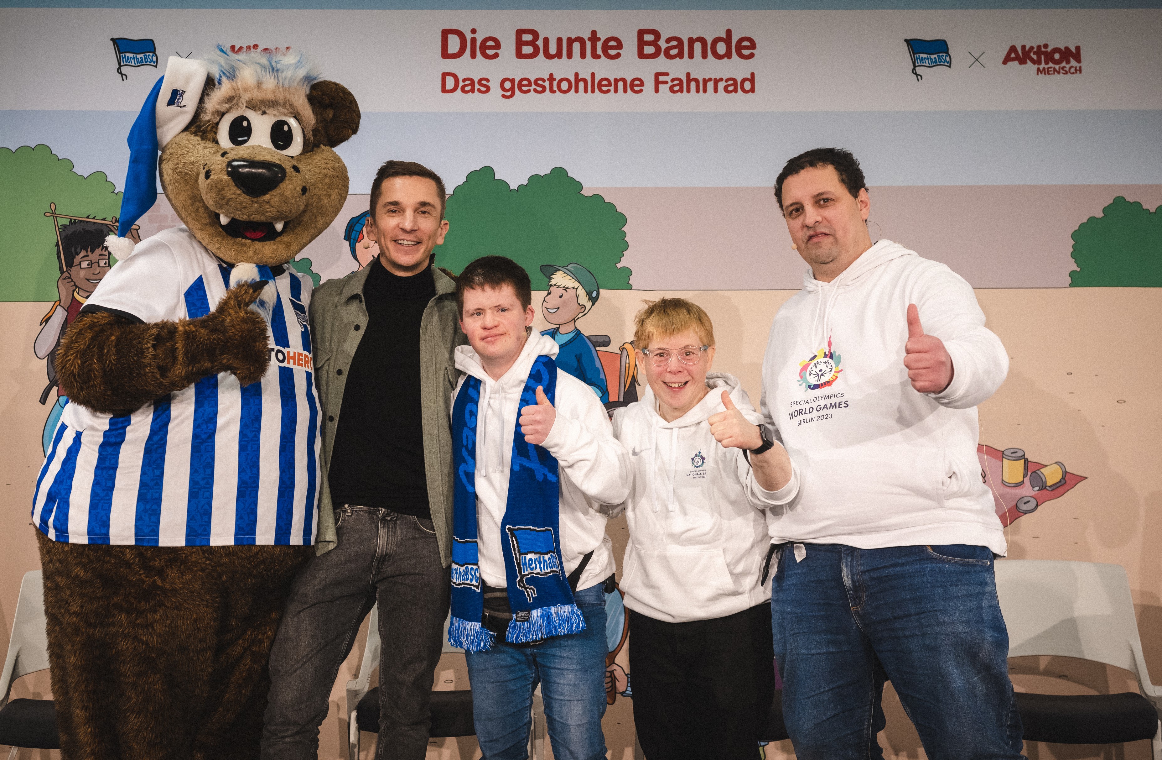 1_ Das Team von Special Olympics bei der inklusiven Lesung von Hertha BSC (v.l.n.r.): Herthinho, Eric Mayer, Arthur Hackenthal, Daniela Huhn, Reynaldo Montoya