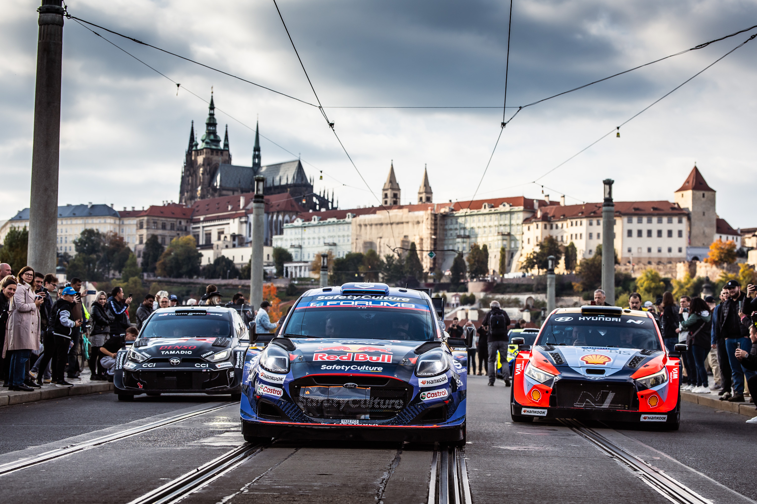 „Ich freue mich sehr, dass die Rallye-Fahrzeuge durch Prag gefahren sind, und noch mehr, dass die Parade von Präsident Petr Pavel persönlich eröffnet wurde“, sagte JUDr. Jan Šťovíček, Präsident des Autoclubs der Tschechischen Republik. „Die WRC-Fahrzeuge mitten im Stadtzentrum zu sehen, fängt den Geist einer WM-Veranstaltung im Herzen Europas perfekt ein.“ Die zwölf Kilometer lange Route der Parade begann um 14:00 Uhr vor dem Hauptsitz des Autoclubs und führte unter Polizeibegleitung an der Staatsoper und dem Nationalmuseum vorbei. Auch Sehenswürdigkeiten wie der Karlsplatz, das Tanzende Haus, das Nationaltheater und die Karlsbrücke lagen auf der Route zum Rudolfinum, wo die Fahrer fast eine Stunde lang Halt machten, um Fans und Journalisten zu treffen. Der Rückweg führte über die Mánes-Brücke mit dem Panorama der Prager Burg im Hintergrund zurück in die Altstadt. Der Nachmittag endete schließlich mit einer Autogrammstunde und einem Fan-Treffen am Hauptquartier des Autoclubs der Tschechischen Republik.